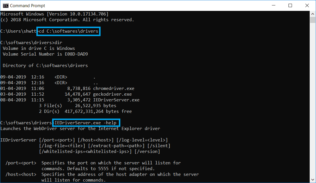 - IEDriverServer.exe -help: It will list all the options available to use with IEDriverServer.exe. Hence, we can select as per our needs.